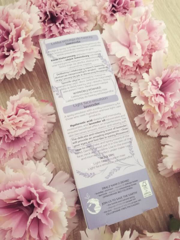 Emulsja zapakowana w kartonik w lawendowym kolorze, tak samo właściwe opakowanie z emulsją utrzymane w tym samym tonie. Piękna szata graficzna, niespotykana w innych kosmetykach sprawia że chce się po nie sięgnąć. Produkt posiada atomizer co ułatwia odpowiednie dawkowanie. Konsystencja lekka niczym mgiełka szybko się wchłania. Idealny gdy potrzebujemy szybkiego nawilżenia, szczególnie rano lub po basenie kiedy chlor wysusza skórę. Idealny także w podróży, jego płynna konsystencja powoduje że kosmetyk natychmiast jest wchłaniany. U mnie sprawdził się