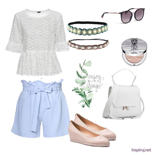 Jej wizja, skomponowana z myślą o nadchodzących dopiero ciepłych dniach, jest zestawieniem białej koronkowej bluzki z baskinką i rękawem do łokcia z eleganckimi szortami z wysokim stanem w odcieniu ultramaryny. Towarzyszą mu półbuty w kolorze nude o ciekawym fasonie, wydłużającym się ku tylnej części buta, fantazyjna biała torebka z ciekawym zapięciem i porządne ciemne okulary. Kropką nad „i” jest jednak ozdobna, kolorowa opaska z kamieniami – do wyboru w zależności od nastroju danego dnia. Przynosi ona bardzo subtelny i nie narzucający się powiew orientu, dzięki któremu stylizacja nabiera luzu i wakacyjnego charakteru. Byłaby idealna na przykład na weekendowy city break z przyjaciółmi. Element wieńczący całość to puder i rozświetlacz w jednym, dzięki któremu z łatwością zatuszujemy wszystkie niedoskonałości i dodamy cerze blasku.
