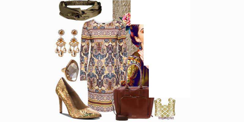 Bajecznie kolorowa sukienka od bonprix została tu zestawiona z delikatnie połyskującymi, złotymi szpilkami od Solo Femme i pojemną brązową torebką Royal Republiq, która świetnie przełamuje pstrokaciznę sukienki. Outfit doskonale wykańcza bogata biżuteria w postaci wiszących złotych kolczyków z ruszającymi się na wietrze kryształkami, złotego pierścionka z masywnym kamieniem i złotej ażurowej bransolety. Ostatnim akcentem jest satynowa opaska do włosów, która tworzy idealną kropkę nad i. W takim stroju z pewnością miałoby się ochotę wyruszyć w egzotyczną podróż i dać się porwać przygodzie!