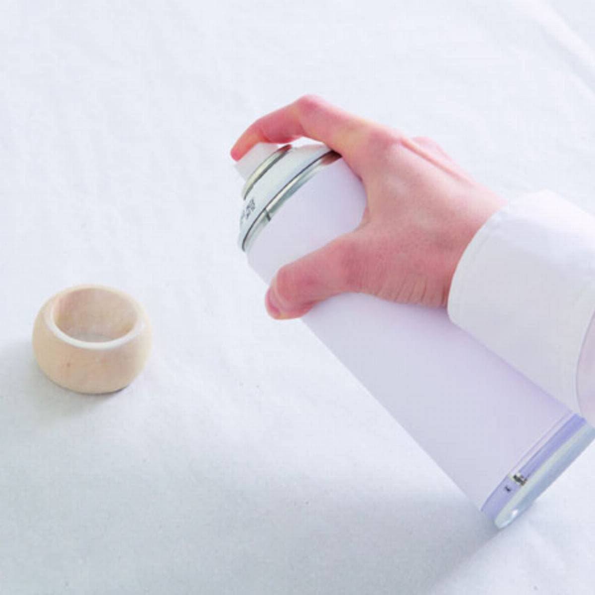 Zacznij od pomalowania obrączek farbą w aerozolu. Wybierz swój ulubiony kolor i nadaj zwykłym drewnianym ozdobom zupełnie nowy wygląd. Następnie pozostaw je do wyschnięcia.
