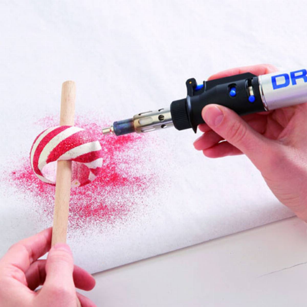 Roztop naniesiony puder palnikiem Dremel VersaTip z założoną końcówką do usuwania farby. Po ostygnięciu materiał będzie mocno i trwale przylegać do obrączki. Udanej kolacji!