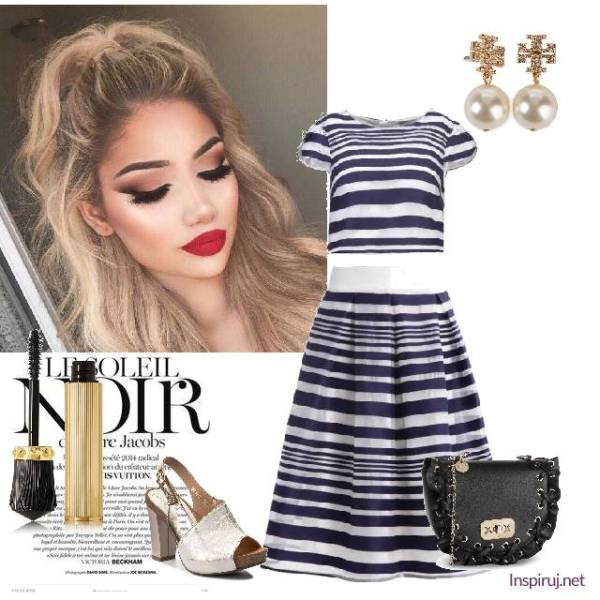 Drugi outfit ma za podstawę uroczy zestaw w marynarskie paseczki – bluzkę z rozkloszowaną spódnicą. Ten total look nie potrzebuje dodatków. Ich nadmiar mógłby zaburzyć jego odbiór. Wystarczą metaliczne sandałki na platformie i grubym słupku, niewielka czarna torebka oraz złote kolczyki z perłą. Nieodzowne będą też mocno wytuszowane rzęsy, dzięki którym twarz nie zostanie przyćmiona przez dużą ilość pasków!