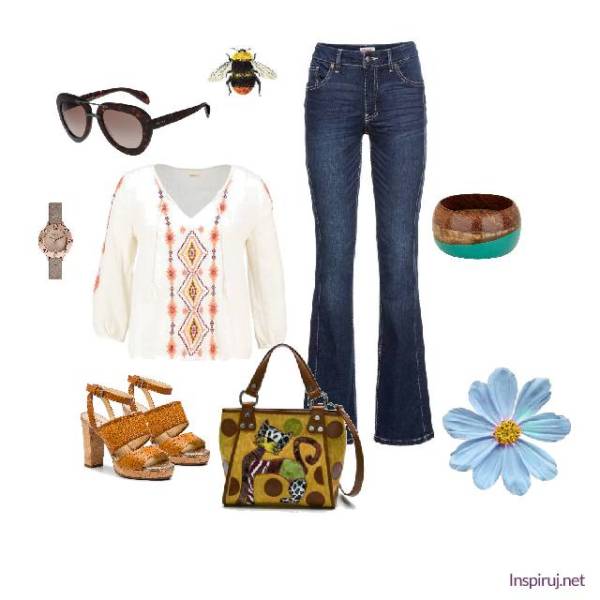 Pierwsza z nich bazuje na kultowym, hippisowskim połączeniu jeansowych dzwonów z haftowaną koszulą w stylu boho. Dodatki to obowiązkowe sandałki na platformach i szerokim słupku, ciemne okulary w grubych oprawkach, młodzieżowa torba z kotem i szeroka, drewniana bransoleta w trzech zacierających się odcieniach. Wystarczy jedno spojrzenie na ten outfit, by poczuć wakacyjne wibracje i chcieć zatrzymać lato na dłużej!