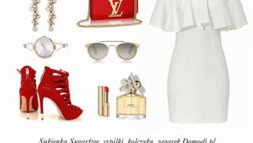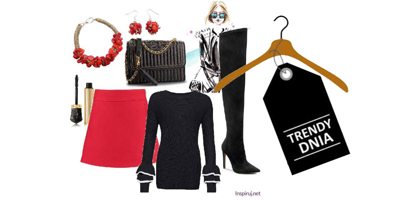 Nasza Inspirantka pomysłowo sięgnęła po kamienie swoim wyglądem przypominające owoce jarzębiny, która to jest nieodłącznym towarzyszem jesieni. Czerwone, dlatego też pełne życia koraliki pojawiają się na pięknych kolczykach i bransoletce. Prawdziwego uroku i naturalnego wyrazu dodaje pojawiający się w biżuterii len. Ozdoby świetnie komponują się z casualową, niezwykle kobiecą całością. Czerwona, lekko rozkloszowana spódnica odsłaniająca wydłużone modnymi muszkieterkami nogi występuje w towarzystwie swetra z nieoczywistymi, bo okraszonymi falbanami rękawami. Nie mogło też zabraknąć małej czarnej torebki na złotym łańcuszku.