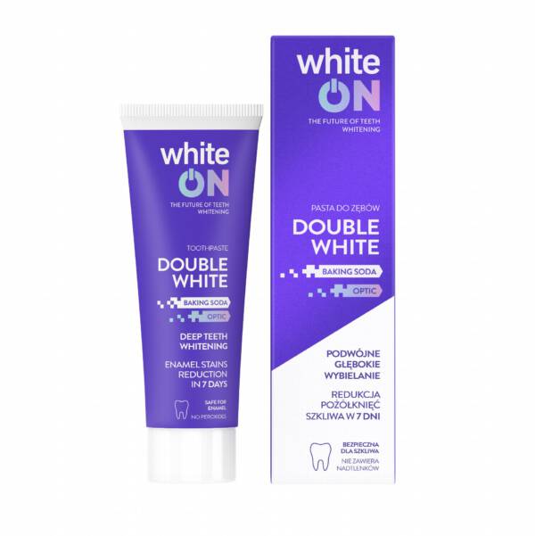 O Wasz piękny uśmiech zadba nowa pasta whiteON Double White! To unikalne połączenie aktywnych składników: Optycznego Rozjaśniacza i sody oczyszczonej, pozwoli Wam uzyskać natychmiastowy efekt wybielenia i utrwalić go w zaledwie kilka dni! Pasta Double White utrwala biel zębów za sprawą odwrócenia głębokich pożółknięć szkliwa, nagromadzonych w efekcie częstego picia kawy, herbaty czy wina, a także palenia tytoniu i jedzenia owoców z kwasami. Jej regularne stosowanie pozwala usunąć nawet ciemne przebarwienia nazębne i zapobiega tworzeniu się nowych przebarwień szkliwa.