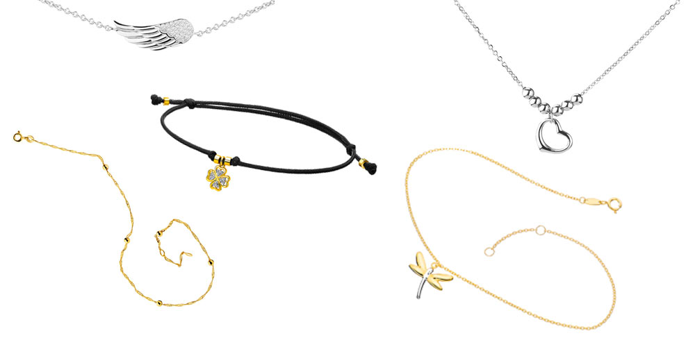 Złote i srebrne bransoletki na kostkę, Apart, cena: 144 zł (skrzydło), 119 zł (serce), 379 zł (koniczynka), 259 zł (złote kuleczki), 319 zł (ważka)