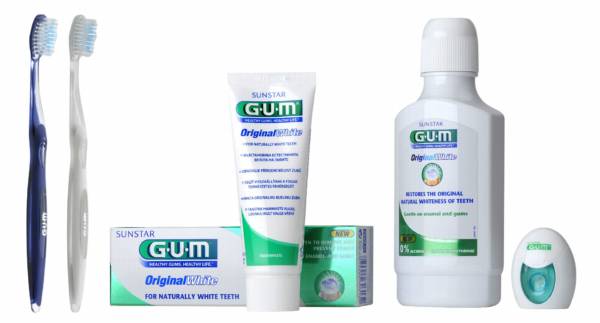 Specjalistyczna seria GUM Original White pomaga odzyskać naturalną biel zębów. Ich zadaniem jest także profilaktyka, czyli zapobieganie ponownemu pojawianiu się plam i problemom z dziąsłami. Regularnie stosowana szczoteczka z tej serii dzięki specjalnemu kształtowi główki i włosia pokrytego elastomerem, skutecznie usuwa płytkę nazębną. Najlepsze rezultaty daje stosowana razem z pastą GUM Original White. Dzięki specjalnej pianie mikropęcherzykowej usuwa przebarwienia, a dzięki zawartości fluoru i izolmatu wzmacnia szkliwo. O kondycję dziąseł zadbają także witamina E, prowitamina B5 i alantoina, zawarte w bezalkoholowym płynie do płukania Original White. Fluor znajduje się także w woskowanej nici dentystycznej, stworzonej specjalnie po to, by usuwać przebarwienia i zanieczyszczenia z wyjątkowo trudno dostępnych miejsc.