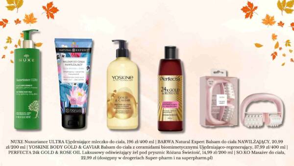 Dlatego już wczesną jesienią warto zamienić lekkie mleczka nawilżające na kosmetyki o bogatszym składzie, zawierające m.in. ceramidy, które działają jak cement i pomagają odbudować warstwę rogową naskórka. Działają jak plaster ratunkowy na przesuszone partie ciała, zmniejszają uczucie szorstkości i ściągnięcia oraz zapobiegają utracie wilgoci. Warto też sięgać po produkty zawierające masło shea, czy naturalne oleje, które nie tylko działają nawilżająco, ale przywracają także skórze elastyczność. By uprzyjemnić sobie jesienną pielęgnację skóry przyda nam się także masażer. Delikatne rolowanie ciała tuż przed nałożeniem balsamu sprawia, że składniki kosmetyku lepiej się wchłaniają a tym samym działają szybciej i skuteczniej. Co więcej, regularne masowanie pobudza krążenie, usprawnia usuwanie toksyn z organizmu i działa antycellulitowo. Wystarczy kilka minut wieczorem, by szybko zauważyć poprawę w wyglądzie skóry. Oto produkty, po które szczególnie warto sięgać jesienią.