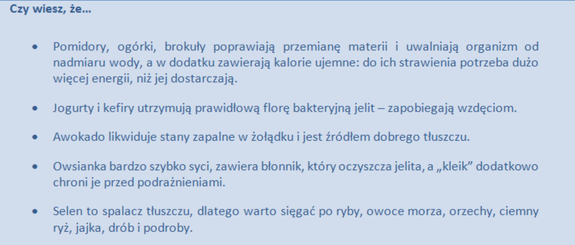 Ostatni ważny punkt, to ilość jedzenia. Przygotowując posiłki zgodnie ze zdrowymi zasadami, spróbuj od razu dzielić je na porcje. Chodzenie do pracy z pojemniczkami może wydawać się śmieszne – i słusznie, bo efekty takiej poukładanej diety są przecież powodem do radości. Małe pudełeczka wypełnione płatkami owsianymi, potrawką z kurczaka i sałatką ze świeżych pomidorów otwieraj co dwie trzy godziny. Płaski brzuch to pełny, a nie przepełniony żołądek.