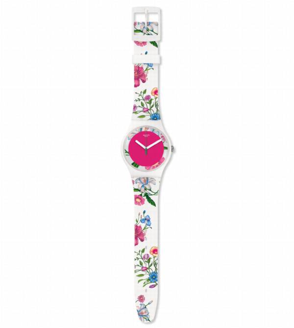 Zegarek z różową tarczą i kwiatowymi aplikacjami na pasku – Swatch, 270 zł