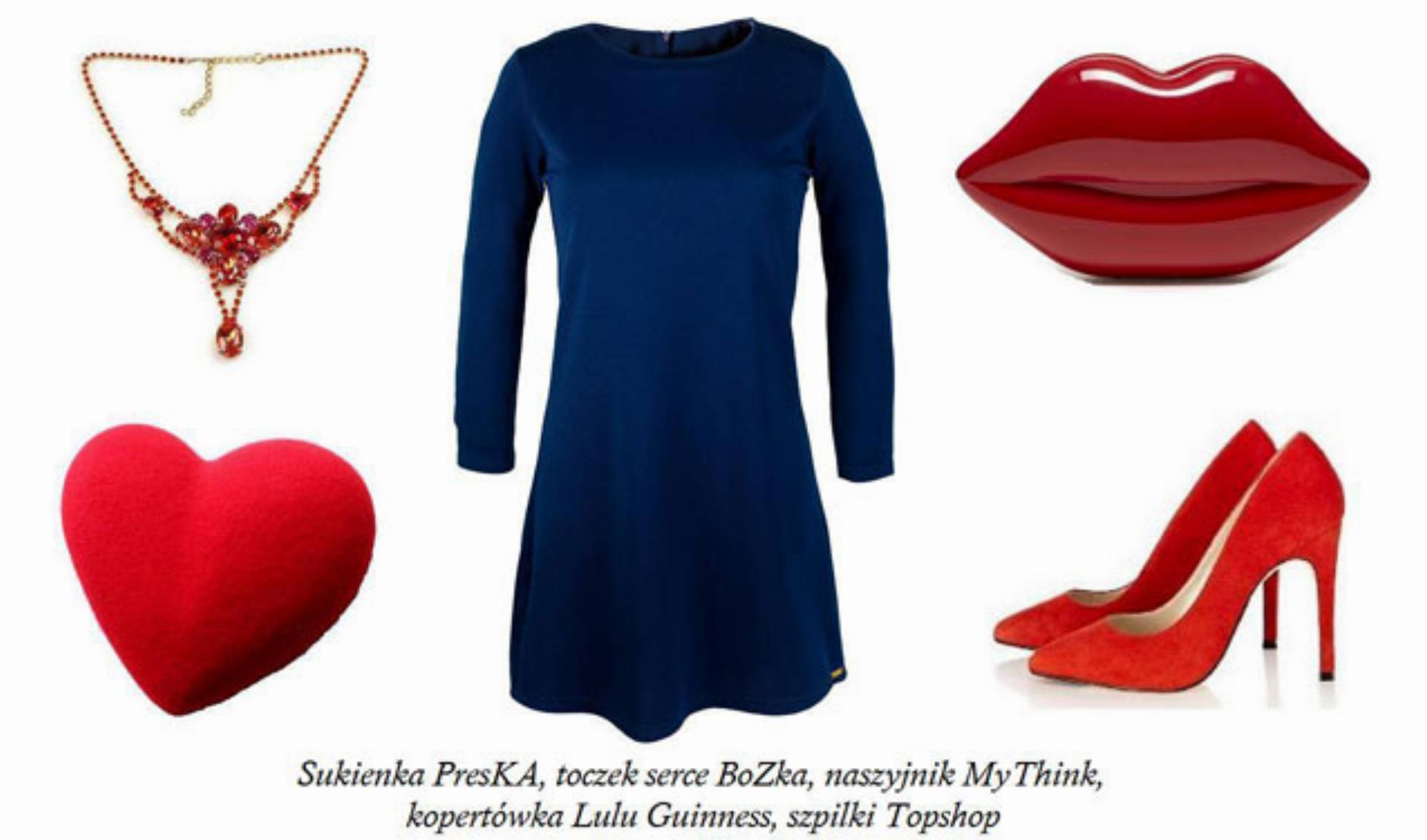 Pierwsza stylizacja to propozycja dla miłośniczek nieco bardziej ekstrawaganckich rozwiązań. Podstawą zestawu jest prosta, granatowa sukienka z lekką asymetrią i nieco dłuższym tyłem marki PresKA. Wykonana z drapowanej tkaniny, pięknie układa się na ciele. Lekko taliowana nadaje kobiecych kształtów. Błysku w stylizacji nada piękny czerwono – różowy naszyjnik, który z klasyczną sukienką stworzy duet idealny. Ciekawym uzupełnieniem i mrugnięciem oka do obserwatora będzie niebanalny, nieduży, lekki, czerwony toczek w kształcie serca oraz zabawna kopertówka w kształcie ust. Zamszowe szpilki jeszcze bardziej wysmuklą sylwetkę.