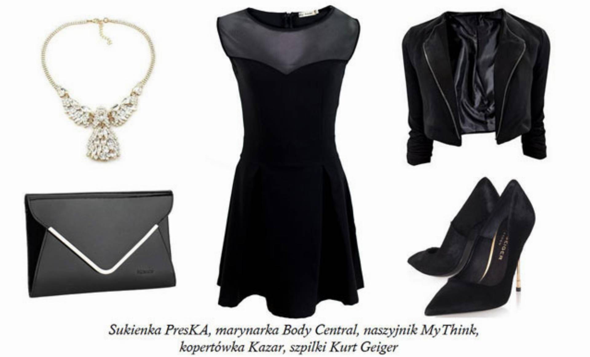Kolejna nasza propozycja przypadnie do gustu fankom czerni. W roli głównej czarna sukienka w kontrafałdy PresKA. Góra wycięta w kształt serca, wykonana z delikatnej siateczki wspaniale eksponuje i podkreśla biust. Na wierzch proponujemy otwarty, krótki żakiecik, a jako biżuterię naszyjnik z aniołem nawiązujący do świątecznego czasu. Do takiego zestawu idealnie sprawdzi się klasyczna czarna kopertówka z lakierowanej skóry. Kapitalne szpilki, wykonanie z włosia i zaopatrzone w smukły, złoty obcas, nadadzą charakteru całej stylizacji.