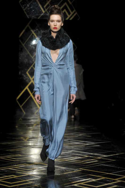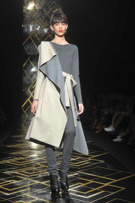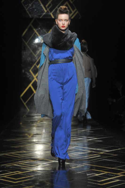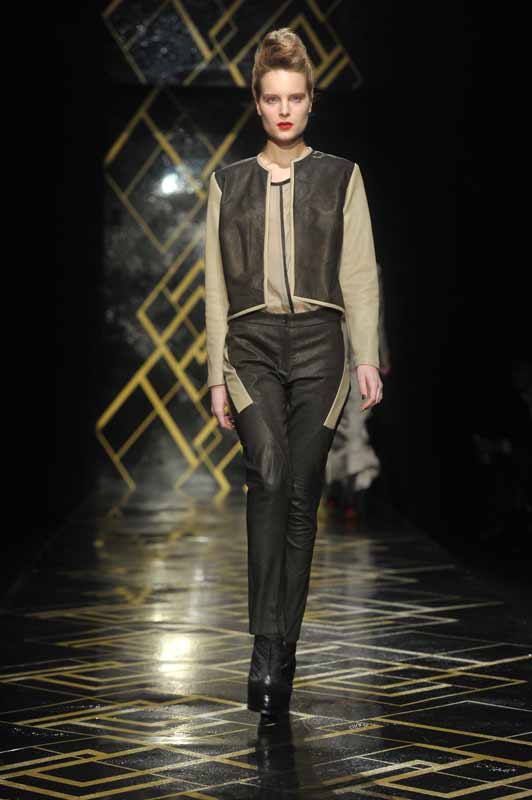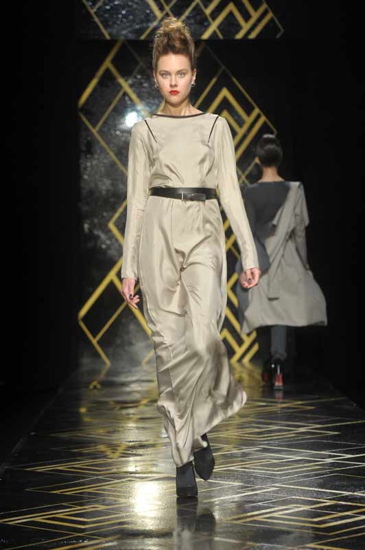 Gama kolorów oscylująca wokół ciemnych tonów, rozjaśnionych błyskiem i akcentami koloru, szmaragdowo-zielonego i niebieskiego. W kolekcji zastosowano tkaniny typu double face pozwalające na różne interpretacje jednego ubioru. Kontrast powierzchni, faktur, połączenie luksusowych tkanin, naturalnych skór nadaje kolekcji dawnego klimatu ART DECO pokazanego w nowym wydaniu.