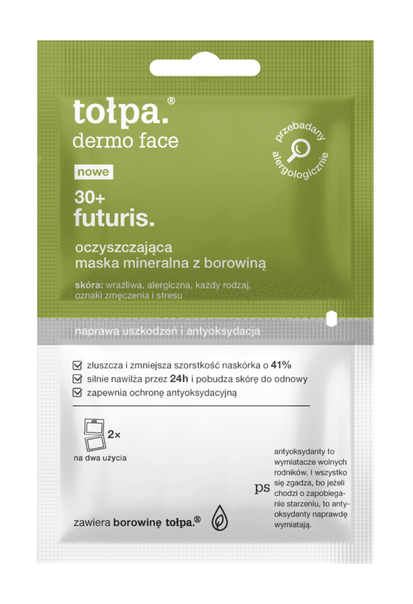 6. futuris 30+ oczyszczająca maska mineralna z borowiną tołpa.® – stanowi doskonałe uzupełnienie rutyny pielęgnacyjnej. Wystarczy, że zastosujesz ją raz w tygodniu. Zaaplikuj maskę na oczyszczoną twarz i pozostaw na ją około 10 minut, do chwili gdy wyschnie. Następnie rozmasuj ją zwilżonymi dłońmi, aby zmienić suchą glinkę w oczyszczającą piankę, która głęboko oczyści, złuszczy