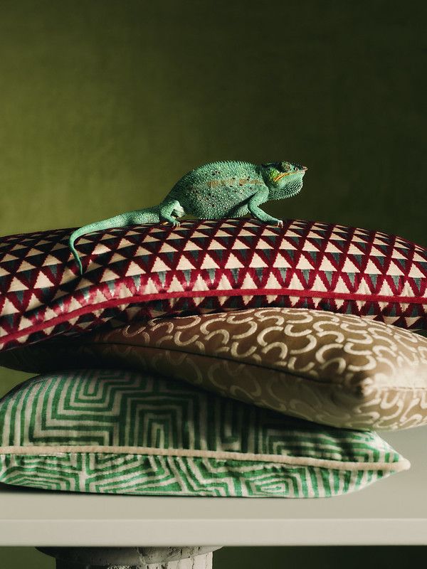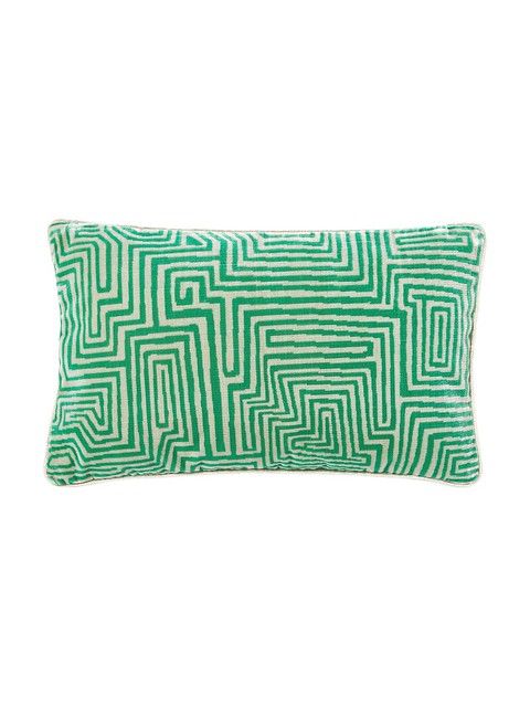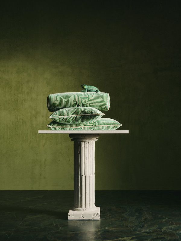 Zielone poduszki z labiryntowym wzorem w stylu art deco, nadające wnętrzu wyrazistości.