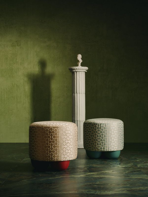 3. Pufy z charakterystycznymi wzorami: Okrągłe pufy w różnych wersjach kolorystycznych – czarno-złotej oraz miętowo-złotej. Ich subtelne, eleganckie wzory sprawiają, że świetnie sprawdzą się jako elementy dekoracyjne i praktyczne w każdym wnętrzu.