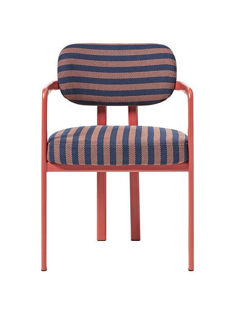 2.Krzesła w paski: Krzesła z tapicerką w odważne, kontrastowe paski granatowo-różowe, z delikatnymi ramami w odcieniu terakoty. Idealne jako akcenty w jadalni lub biurze.