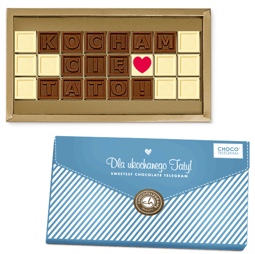 Niezawodną opcją jest też pyszny Czekoladowy Telegram, czyli nasza usługa Chocotelegram, w której ułożymy wybrane przez Ciebie zdanie dedykowane tacie: miłego Dnia Taty, dla najlepszego Taty, dla Tatusia, a może coś jeszcze innego? Jeśli nie masz pomysłu, zerknij do kategorii prezenty na Dzień Ojca, w której znajdziesz szereg ciekawych propozycji.