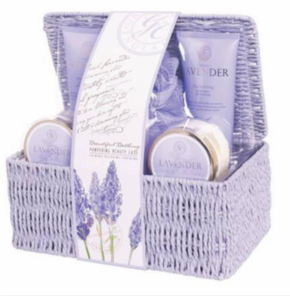 Elegancki koszyk wypełniony kosmetykami o zapachu lawendy. W skład zestawu wchodzą: