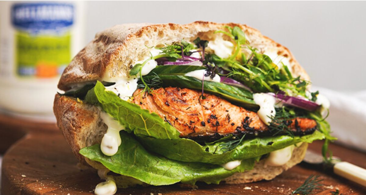 Przekrój ciabattę lub bagietkę na pół, tak aby kawałki chleba nie rozdzieliły się całkowicie (tworząc kieszeń) i posmaruj wnętrze obfitą ilością majonezu Hellmann’s. Ułóż liście sałaty i filety z łososia na majonezie. Dodaj plasterki ogórka, czerwoną cebulę, koperek lub kiełki do smaku.