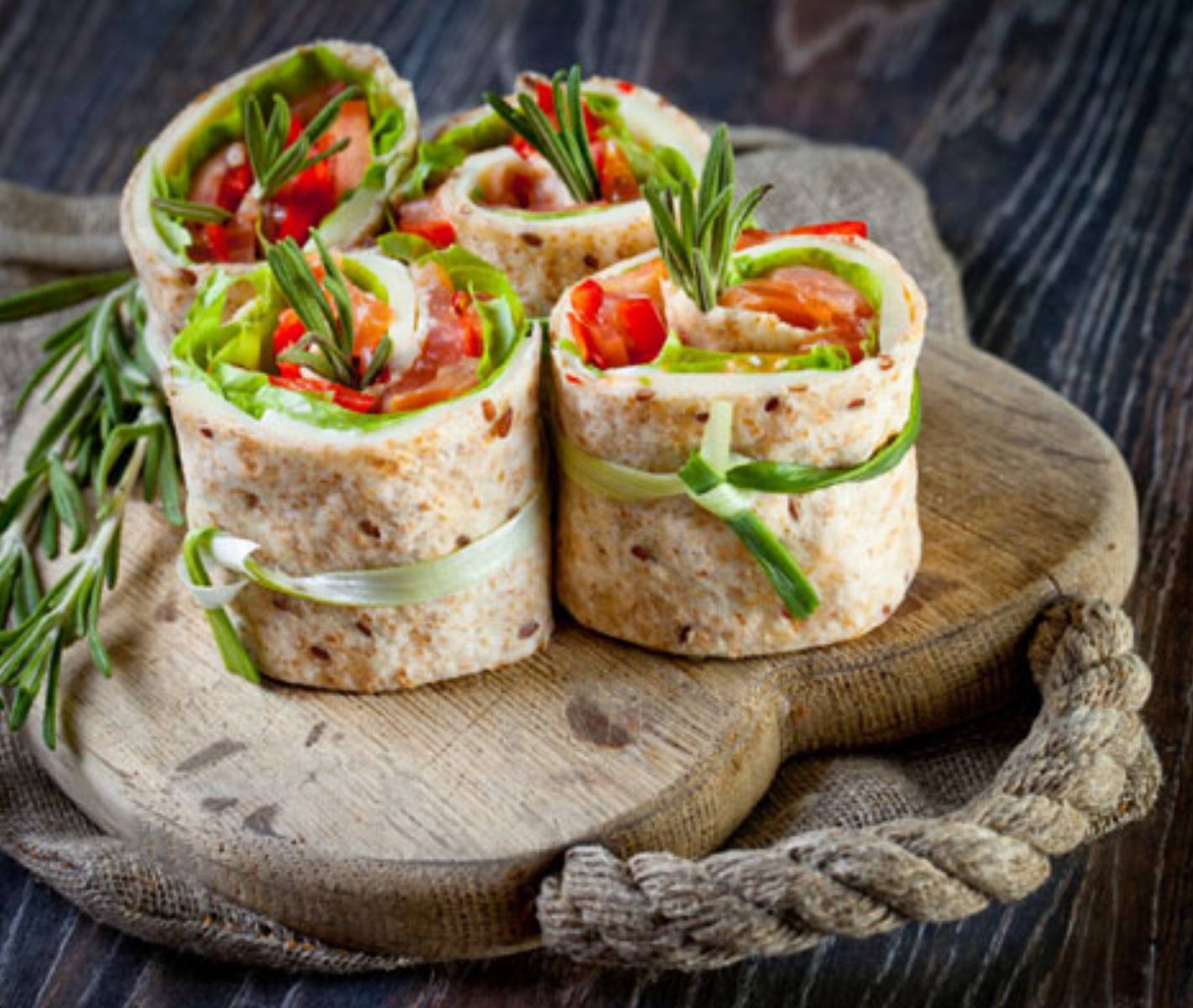 Placki tortilli posmarować z jednej strony sosem koperkowym marki Tarsmak. Na sos położyć liście sałaty, świeży rozmaryn, plasterki łososia oraz cienkie i długie plastry ogórka. Tak przygotowane tortille zwinąć ciasno, pokroić w kilkucentymetrowe kawałki i każdy związać długim szczypiorkiem.
