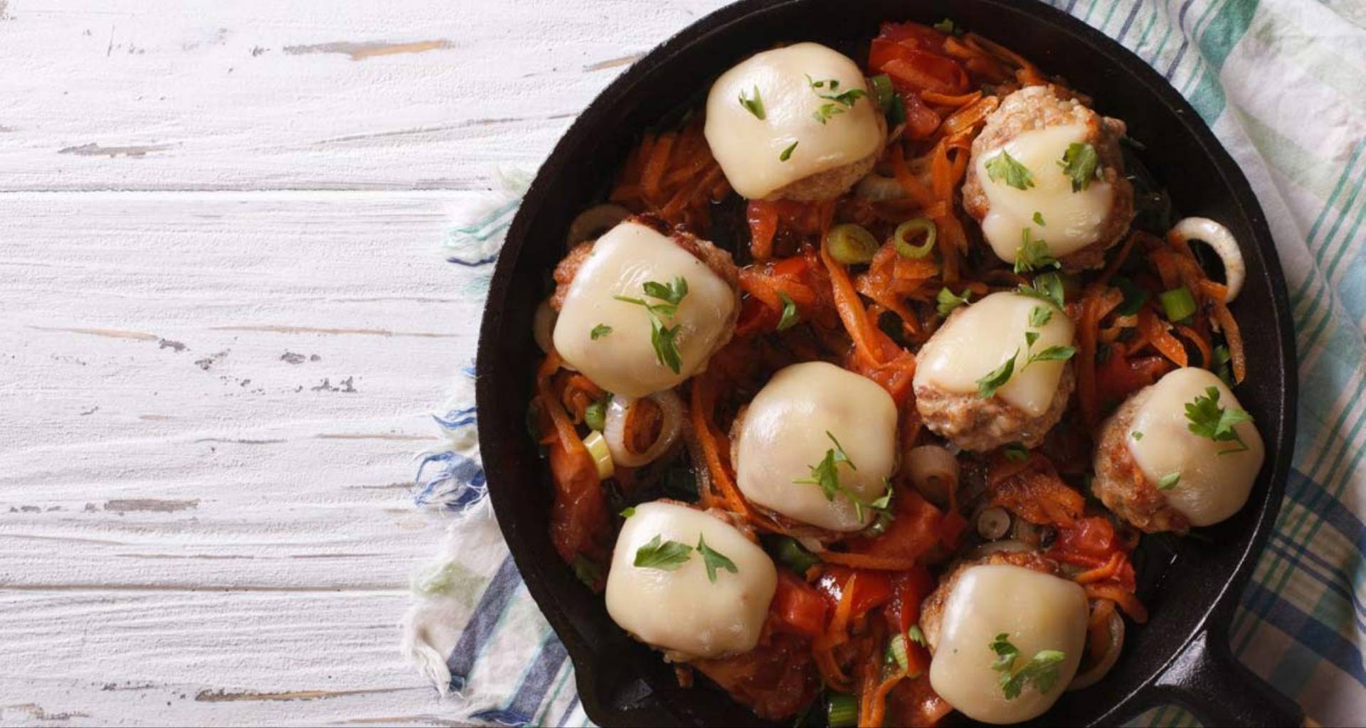 Pulpety drobiowe z duszonymi warzywami i żółtym serem