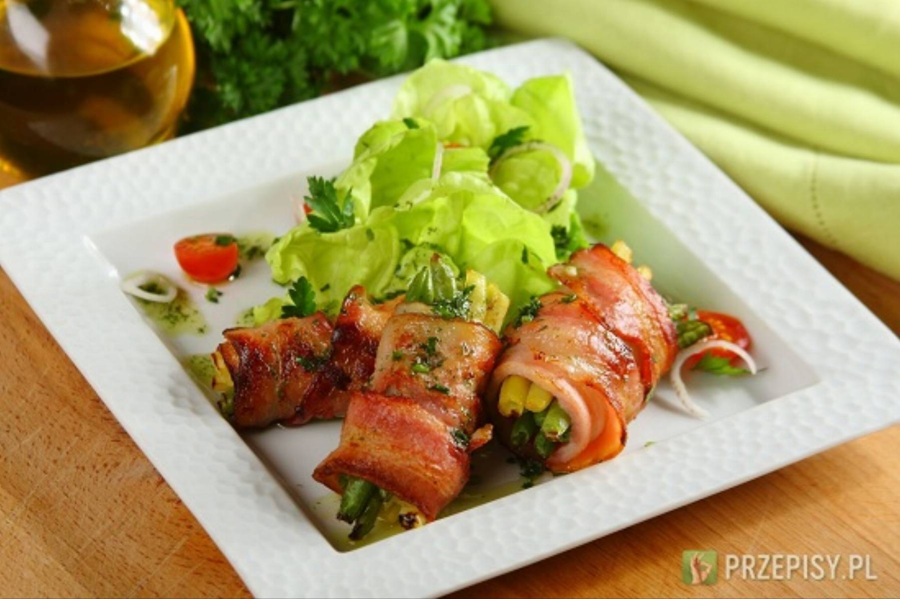- Tak powstałe snopki smaż przez chwilę na gorącym oleju, aż boczek się zarumieni, a tłuszcz sklei całość. Następnie zapiekaj boczek przez 15 minut w piekarniku rozgrzanym do 120 stopni.
