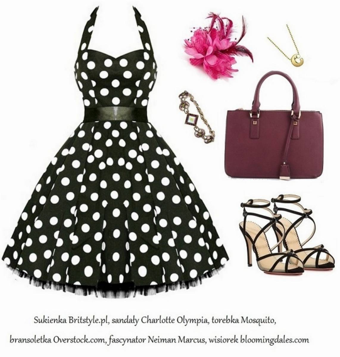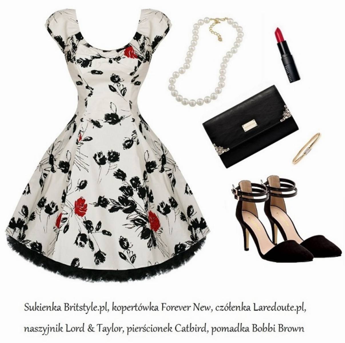 Pierwszy zestaw powinien przypaść do gustu miłośniczkom klasycznej elegancji w stylu Audrey Hepburn. Piękna, rozkloszowana sukienka w kwiaty ze sklepu Britstyle.pl świetnie podkreśla talię! Będzie cudownie wyglądać w połączeniu z perłami, czółenkami z paseczkami wokół kostki oraz elegancką kopertówką. Czerwona pomadka na ustach genialnie dopełni całości.