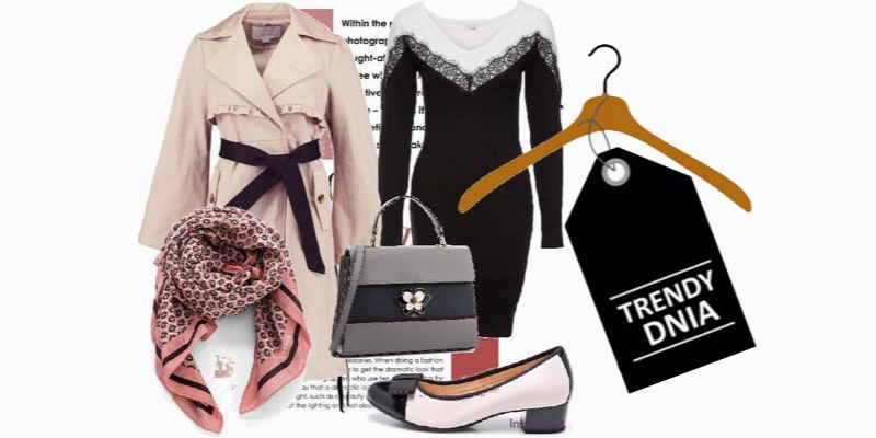 Stylizację pierwszą bez wątpienia możemy zaliczyć do dziedziny romantycznych. W stylizacji widizmy wiele typowo kobiecych, a nawet dziewczęcych detali, które oddają outfit marzycielki. Na uroczym prochowcu w kolorze nude pojawia się zarówno efektowna falbanka, jak i czarna wstęga, która pięknie podkreśli talię. Płaszcz świetne koresponduje z łososiową chustą we wzory. Delikatność aż od niej promienieje, a to za sprawą bawełny i aksamitu, z których to materiałów została wykonana. Pod płaszczem natomiast ukryła się dzianinowa sukienka z koronką. Na nogach pojawiają się z kolei eleganckie czółenka, które pozbawione obcasa z pewnością będą sprzyjały długim romantycznym spacerom. I jak na prawdziwą damę przystało, nie mogło zabraknąć torebki. W naszej stylizacji owa opatrzona została uroczym kwiatkiem i pokryta szarościami, co ciekawie kontrastuje z chustą i prochowcem.