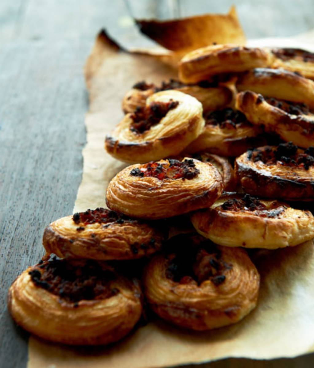 Pomidory i papryki opiec nad płomieniem. Zawinąć w folię aluminiową aby łatwiej było zdjąć skórkę i odstawić do ostygnięcia. Warzywa powinny nabrać lekkiego dymnego aromatu, dzięki któremu cała potrawa zyska charakterystyczny smak. W dużym rondlu rozgrzać oliwę i zeszklić pokrojoną w kostkę cebulę. Dodać kmin rzymski i delikatnie wszystko uprażyć. Partiami dodawać zmieloną wołowinę i pokrojony w paski boczek. Co jakiś czas mieszając zrumieniać mięso. Przyprawić je sosem sojowym i cukrem. Dodać obrane ze skórki i pokrojone w drobną kostkę pomidory. Doprawić pieprzem. Dusić na małym ogniu około 20minut. Dodać obraną i pokrojoną w kawałki paprykę i odsączoną i opłukaną czerwoną fasolę. Gotować jeszcze około5 minut. Pod koniec gotowania podlewać stopniowo potrawę odrobiną wody tak aby powstało trochę gęstego sosu. Przyprawić jeszcze raz do smaku sosem sojowym, pieprzem i TABASCO® dla nadania potrawie odpowiedniej ostrości. Na środek ciasta francuskiego ułożyć porcję mięsa, zawinąć w rulon i posmarować roztrzepanym żółtkiem z mlekiem. Pociąć w plastry o grubości około 1,5 cm. Pieczemy w rozgrzanym do 200*C piekarniku przez 12-15 minut