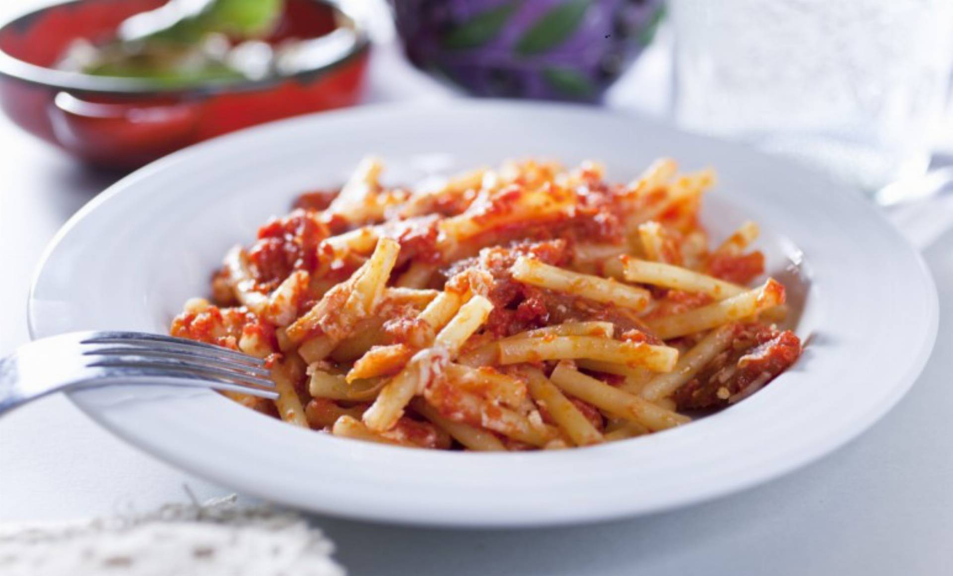 Umieścić plasterki boczku na patelni 24–26 cm pojedynczą warstwą i smażyć na średnim/małym ogniu, aż większość tłuszczu wytopi się z mięsa, odwracając co jakiś czas. Wyjąć mięso na talerz wyłożony papierowymi ręcznikami i usunąć połowę tłuszczu, zostawiając tyle, aby przykryć czosnek, cebulę i płatki papryki. Ponownie umieścić boczek na patelni z warzywami i podgrzewać na średnim/małym ogniu przez 5 minut lub do przyrumienienia cebuli, czosnku i boczku. Doprawić solą i pieprzem, dodać sos pomidorowy i wino, zmniejszyć ogień i trzymać na wolnym ogniu przez 15 minut.