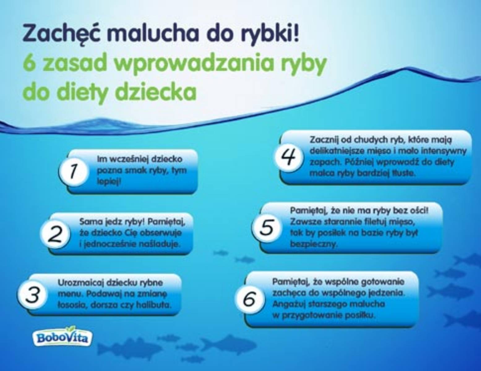 W diecie dziecka mogą pojawić się zarówno ryby słodkowodne, jak i morskie. Te pierwsze są bardziej delikatne w smaku i łatwiej przekonać do nich maluszka, natomiast te drugie mają o wiele więcej nienasyconych kwasów tłuszczowych. Maluch powinien w swoim tygodniowym menu spożywać zarówno ryby chude, takie jak dorsz, mintaj, morszczuk, sandacz, jak i tłuste: łosoś, halibut, śledź, makrela. W diecie dziecka nie powinny znajdować się ryby takie jak ryba maślana, tilapia i panga, przede wszystkim ze względu na dość dużą zawartość zanieczyszczeń.