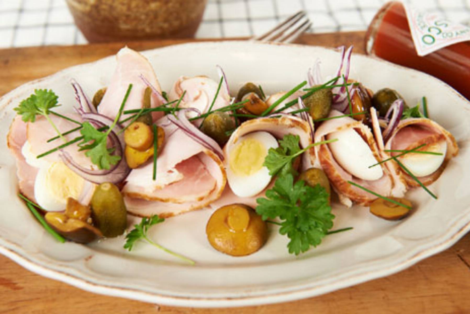 Plasterki zwijamy i układamy na półmisku. Dookoła układamy pokrojone w kawałki korniszony, połówki jajek przepiórczych i marynowane grzybki. Całość obsypujemy posiekaną natką pietruszki, szczypiorkiem i plasterkami cebuli (rozdzielamy je na pojedyncze krążki). Podajemy z ostrym sosem tatarskim. Przygotowanie sosu:Pieczarki, korniszony i cebulę kroimy w drobną kostkę. Mieszamy z majonezem. Przyprawiamy do smaku solą, czarnym pieprzem i sosem TABASCO®. Na koniec dodajemy posiekaną drobno natkę pietruszki. Odstawiamy na godzinę.