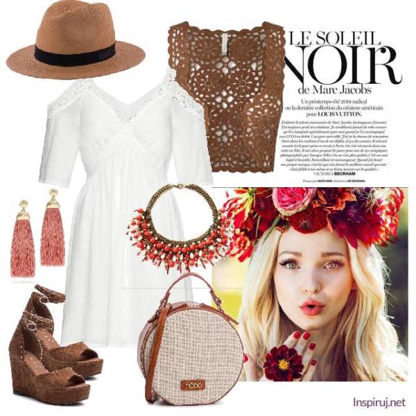 Pierwszy zestaw jest utrzymany w stylu boho, a jego bazę stanowi biała sukienka z koronkowym wykończeniem, odsłaniająca ramiona. Finezji dodają jej retro sandałki na platformach, pleciony kapelusz, świetnie chroniący przed intensywnym słońcem i ażurowa kamizelka nawiązująca do dzierganych hippisowskich narzutek. Całość uzupełnia efektowna biżuteria, ruszająca się na wietrze i podczas tańca oraz okrągła torebka typu kuferek. Outfit doskonały zarówno na wielkie koncerty, jak i pikniki czy artystyczne warsztaty na świeżym powietrzu.