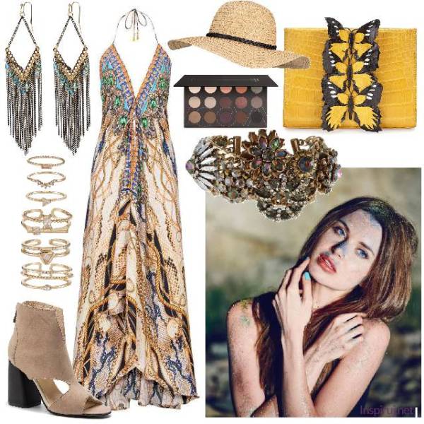Druga stylizacja to zdecydowany ukłon w stronę orientu. Jej bazę stanowi piękna, długa sukienka z modnym deseniem łączącym nadruki z chust, zwierzęce motywy i indyjski patchwork. Dodatki to słomiany kapelusz, typowa dla festiwalowych outfitów duża ilość brzęczącej, ruszającej się w tańcu i połyskującej biżuterii oraz bardzo oryginalna kopertówka z motylami. Autorka nie zapomniała także o kolorowym makijażu, uwzględniającym szeroką paletę barw. Patrząc na nią, naprawdę ma się ochotę poszaleć pod sceną!