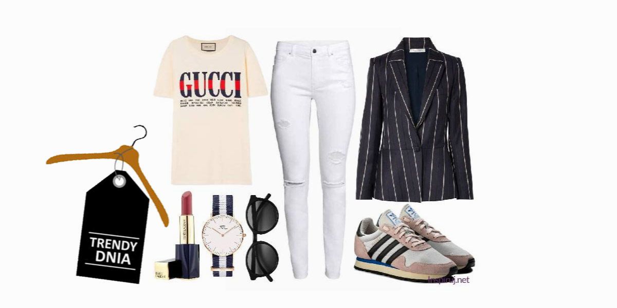 W dzisiejszej stylizacji swoje miejsce znalazły białe spodnie z przetarciami, które pasują zarówno do bardziej eleganckiej stylizacji, jak i do looku na co dzień. Jasnoróżowy T-shirt Gucci i sportowe buty w odcieniu brudnego różu dodają stylizacji luzu, ale po założeniu marynarki w paski jak za dotknięciem czarodziejskiej różdżki nasz look staje się bardziej szykowny! Elegancji dodaje także zegarek Daniel Wellington z paskiem w marynarski wzór oraz modne okulary przeciwsłoneczne H&M. Dodajemy do tego szminkę i… możemy wyruszyć na majowy podbój miasta!