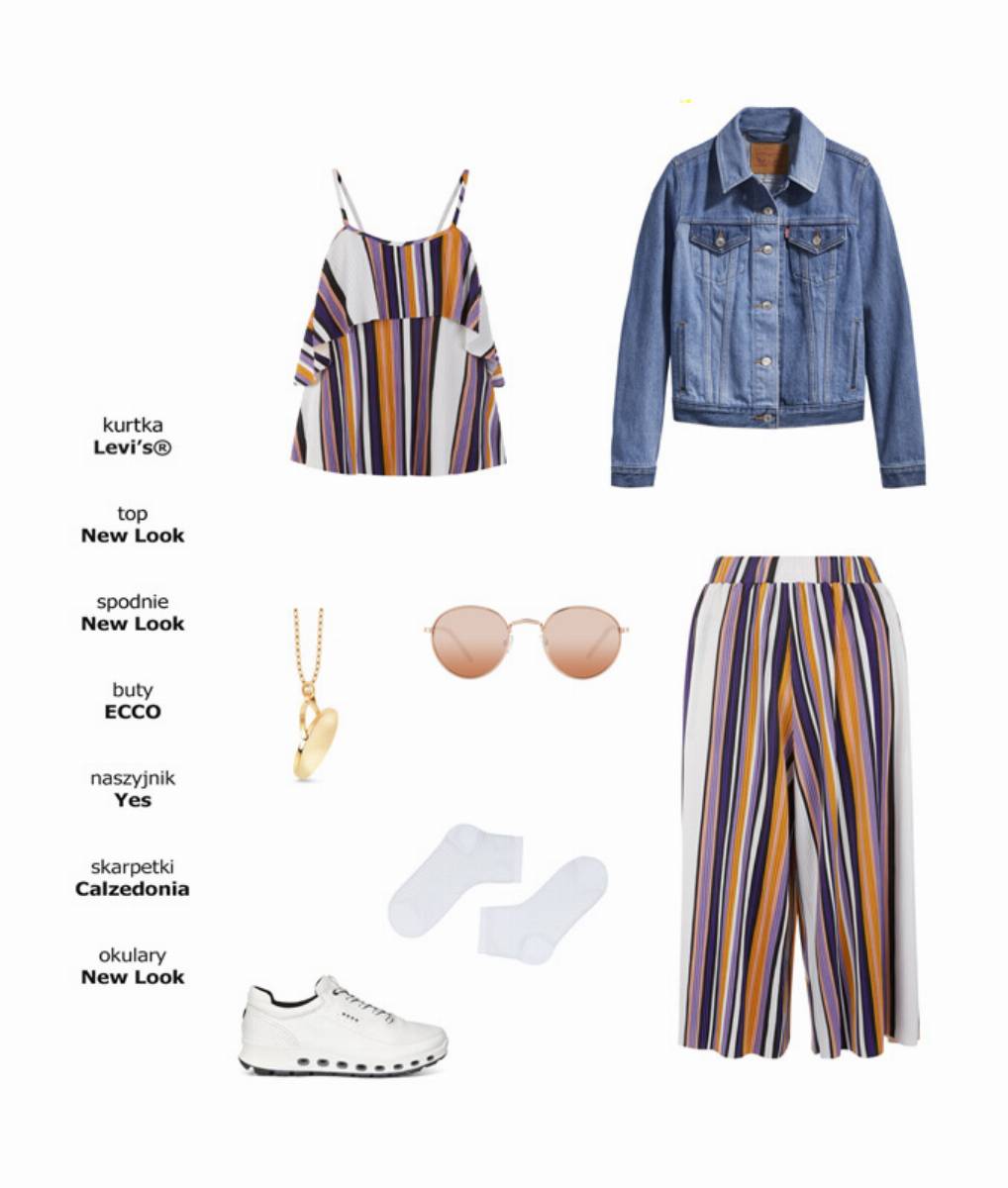 Ponadczasowe paski doczekały się licznych interpretacji – poziome, pionowe, kolorowe, monochromatyczne – każda kobieta znajdzie wersję dla siebie. Kuloty plus sneakersy to propozycja dla Pań, które preferują wygodne, casualowe outfity, ale jednocześnie podążają za trendami. Dodatki w postaci jasnych okularów i złotego łańcuszka przełamują sportowy look, nadając odrobinę kobiecości.