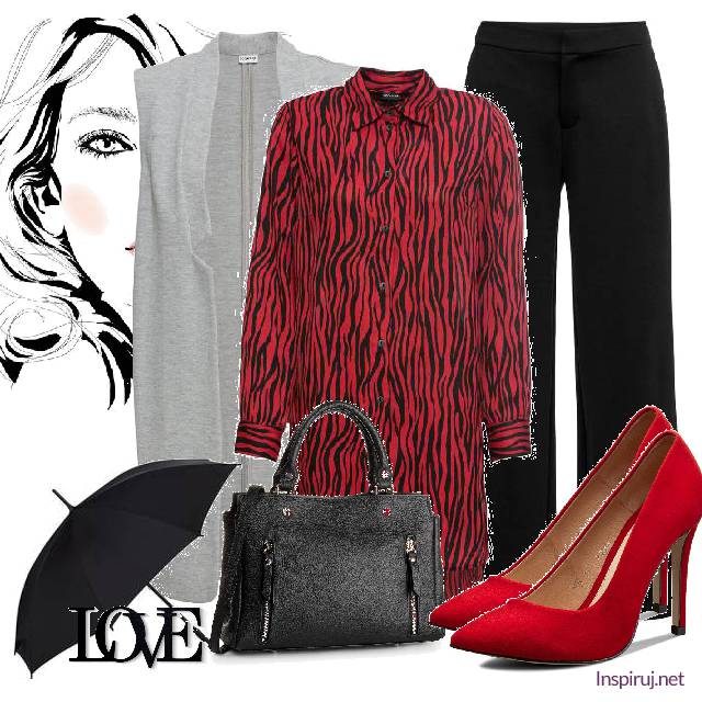 Drugie zestawienie to bardziej elegancka wersja: dla osoby, która jednocześnie lubi klasykę, ale nie stroni od mocniejszych akcentów. Sylwetkę wydłużą szykowne spodnie i czerwone szpilki Baldaccini. Pazura nadaje bluzka ze stójką w kolorze chilli w modny zwierzęcy motyw, czyli w paski zebry. Pojemna torba oraz parasol to niezbędnik studentki na pierwsze jesienne dni na uczelni. Drugi zestaw to look dla pewnej siebie, dynamicznej dziewczyny.