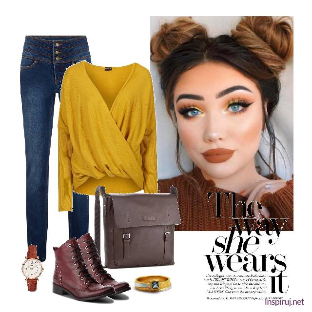 W pierwszej kompozycji z granatem spodni kontrastuje miodowy sweterek marki Bonprix. Zarówno dżinsy, jak i dzianinowy sweter wyszczuplą sylwetkę, a także podkreślą kobiece atrybuty – talię czy dekolt. Drapowania bonprixowego swetra przełamują symetrię, a drobny pierścionek z kwadratową cyrkonią jest kropką nad i. Studenckiego, streetowego looku nadają botki Lasockiego oraz torba Joop! Ten outfit świetnie wpisuje się w jesienny klimat i oddaje młodzieńczego ducha.