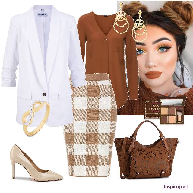 Pierwsza odsłona to stonowana kompozycja idealna na przykład do biura. Dzianinowa spódnica w kratę wysmukli sylwetkę, a biały żakiet doda profesjonalizmu wizerunkowi. To stylizacja, w której możemy wyobrazić sobie Rachel Green przemierzającą korytarze Bloomingdale’s.