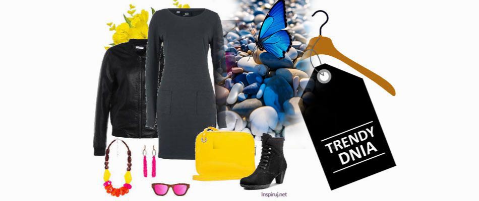 Trend na kolory fluo jest naprawdę trudny do wdrożenia w codziennej, casualowej modzie. Ludzie niezaznajomieni z bieżącymi tendencjami często przypisują bowiem „prawo” do noszenia intensywnych odcieni jedynie młodym osobom. Tymczasem z modą tą można sobie wspaniale poradzić, uciekając się do dodatków i akcesoriów w elektryzujących kolorach, które zestawimy ze stonowaną, ciemną lub jasną bazą. Sposób ten wykorzystała właśnie jedna z naszych Inspirantek. Zestawiła ona sukienkę ze stretchem i długimi rękawami od Bonprix w modnym ostatnio odcieniu old grey z czarną bomberką JDY z suwakiem i oryginalnymi, czarnymi botkami Gabor ze sznurowaniem na niewysokim obcasie. Całość rozświetliła natomiast neonowymi dodatkami marki Quiosque w postaci małej, żółtej torebki na ramię i masywnego, drewnianego naszyjnika z bakłażanowymi, żółtymi, różowymi i oranżowymi koralami. Stylizację wykończyła intensywnie różowymi kolczykami z chwostem oraz – dosłownie – różowymi okularami o oprawce z czerwonego drewna palisandrowego. Czy można wyobrazić sobie bardziej optymistyczny zestaw na deszczowe dni? Stylizacja z neonowymi dodatkami sprawi, że przy każdym spotkaniu obdarzymy bliskie nam osoby garścią pozytywnej energii i wspomnieniem ciepłych promieni wakacyjnego słońca. Ładna, komfortowa i zwracająca uwagę, jest świetnym zestawem nie tylko na początek jesieni!