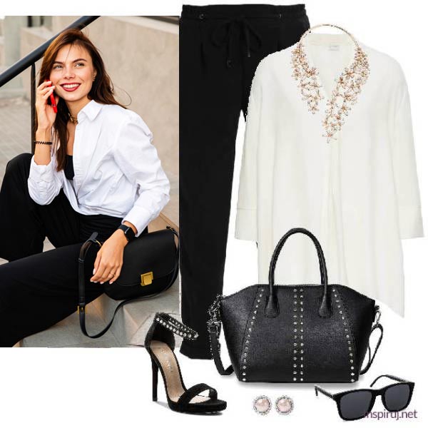 Całość utrzymana w eleganckiej biało-czarnej kolorystyce. Górę tworzy lekka i przewiewna biała bluzka oversize, z dłuższymi bokami i dekoltem w serek od marki bonprix. Do tego – dla zrównoważenia sylwetki – dół to spodnie z wąskimi nogawkami. Wzrok przyciągają szykowne sandały na wysokim obcasie od EVY MINGE (właśnie są w letniej promocji). Jeśli nie możecie nosić takich butów do biura – to wybierzcie coś na niższym obcasie, a te schowajcie do torby i zostawcie na wypad z koleżankami po pracy. Look uzupełnia czarna torba shopperka od bonprix i przyciągająca wzrok kwiatowa kolia.