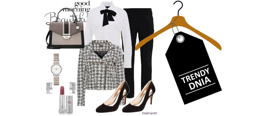Pierwsza stylizacja to strój idealny do pracy lub na businessowe spotkanie. Bazująca na czarnych cygaretkach i białej koszuli z kokardą, świetnie zgrywa się z kurtką w pepitkę o oryginalnym kroju ramoneski. Całość uzupełniają ciekawe, czarne czółenka z wycięciem, listonoszka w stonowanej kompozycji szarości, beżu i czerni oraz elegancki zegarek na bransoletce, w starym stylu. Zrównoważony zestaw w czerni i bieli ożywia szykowna, czerwona pomadka.