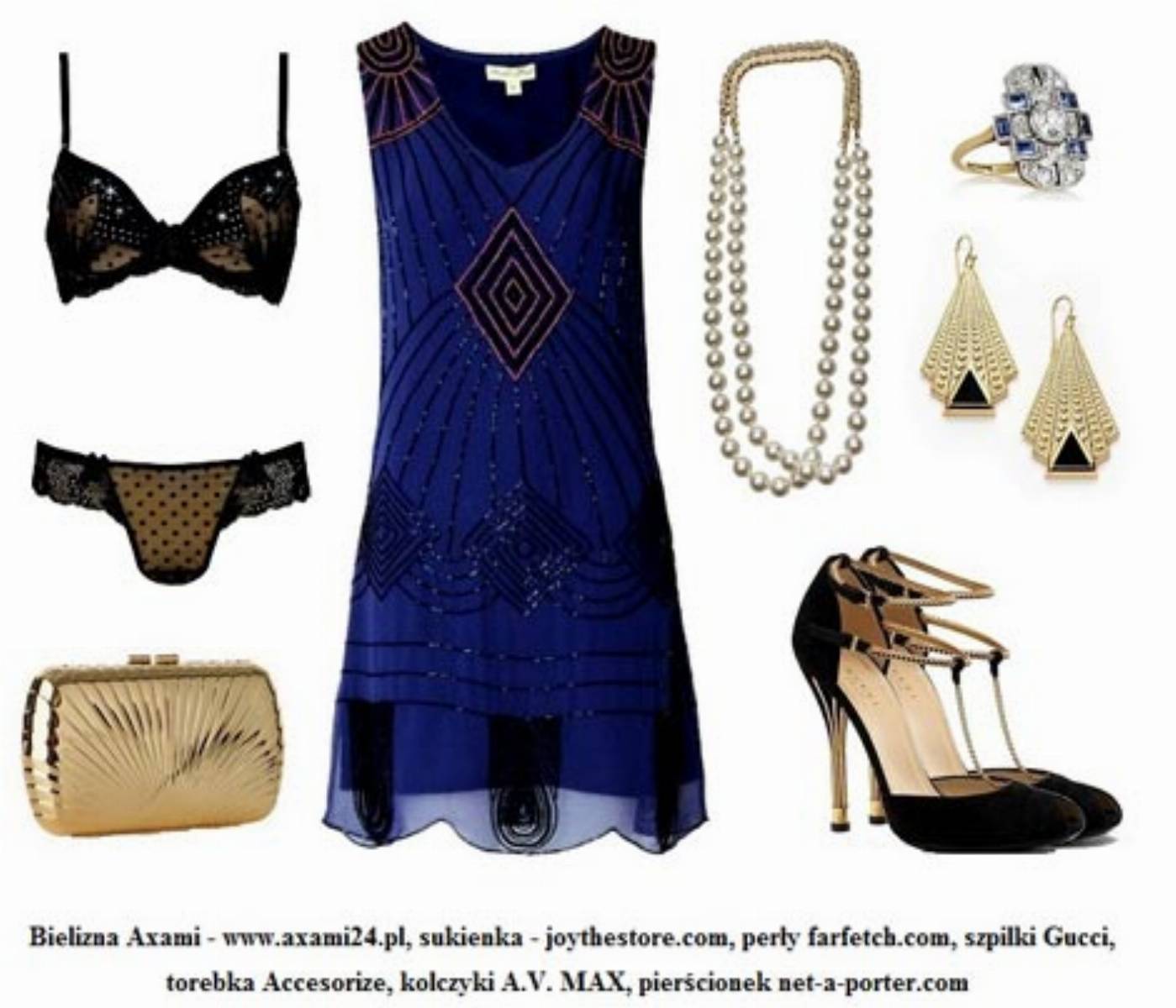 Kobaltowa sukienka z obniżoną talią i geometrycznymi wzorami w stylu art deco spodoba się kobietom ceniącym szyk i elegancję w niecodziennym wydaniu. Świetnie sprawdzi się w połączeniu z czarno-złotymi szpilkami, metaliczną kopertówką oraz biżuterią w stylu vintage – sznurem pereł, dużym pierścionkiem i kolczykami. Żeby poczuć się w niej zmysłowo i kobieco, proponujemy założyć pod spód piękny, zdobiony kryształkami Swarovskiego komplet marki Axami składający się z perfekcyjnego w swojej wytwornej formie push-upa oraz uwodzicielskich string typu brasiliana. Która stylizacja podoba się Wam najbardziej?