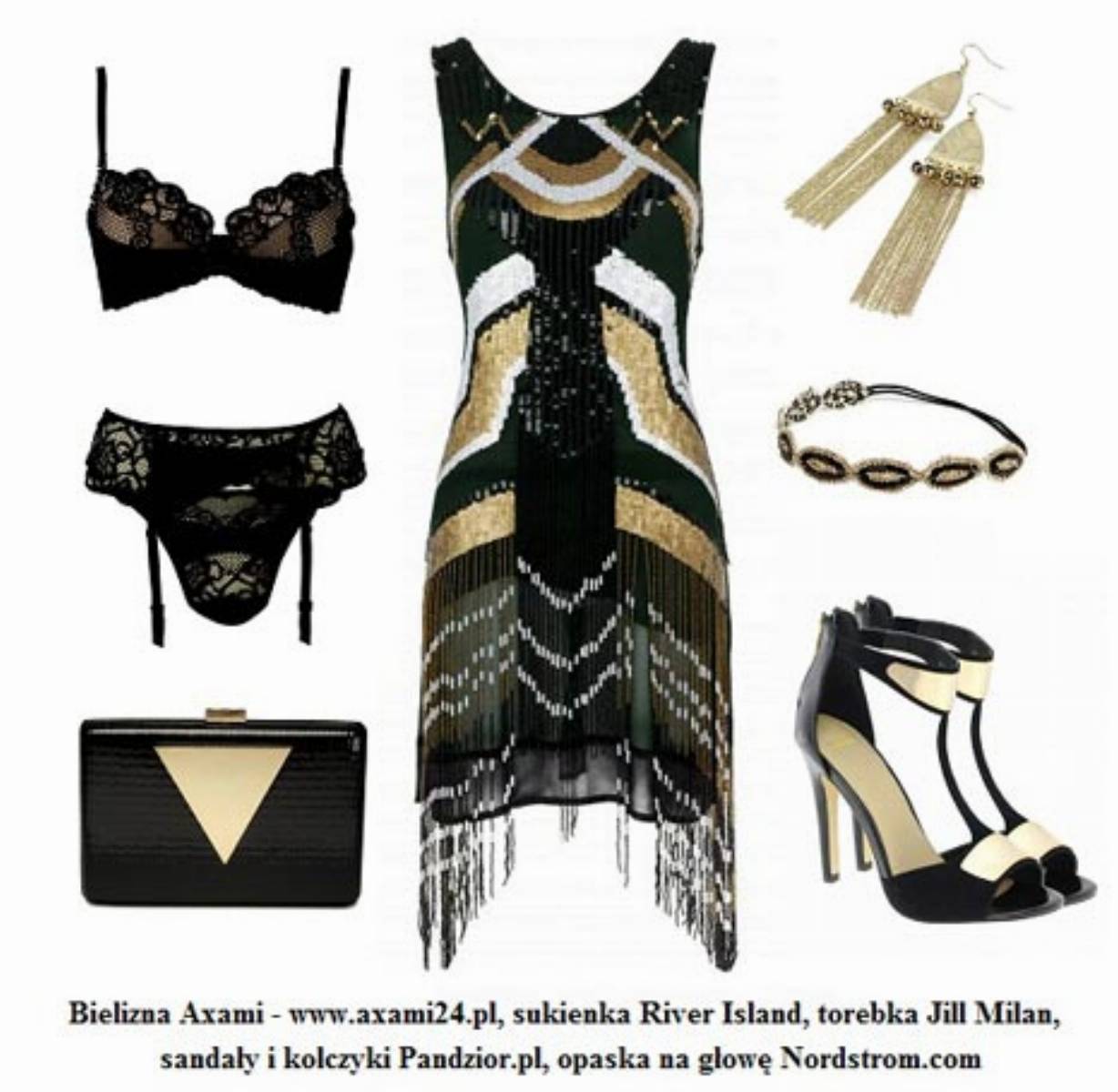 Skąpana w cekinach sukienka, kolczyki z frędzlami, zdobiona koralikami opaska, a także sandały i torebka z metalicznymi wstawkami to propozycja dla kobiet pewnych siebie, świadomych swoich atutów i uwielbiających przykuwać spojrzenia. Właśnie dlatego idealnym dopełnieniem tej stylizacji będzie koronkowa bielizna marki Axami: zmysłowy stanik typu push-up, który podniesie biust i wyeksponuje piersi nadając im piękny kształt, subtelne, ażurowe stringi ozdobione pięknym kwiatowym ornamentem oraz niezwykle kobiecy pas do pończoch, który podkreśli seksowne krągłości.