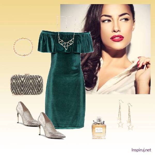 Pierwszy zestaw bazuje na szmaragdowozielonej sukni z hiszpańskim dekoltem, w którym doskonale prezentowałaby się każda blondynka lub ognistowłosa kobieta. Głębię koloru podkreśla ciekawy kontrast ze srebrnymi dodatkami, które dodatkowo go rozświetlają. Są to brokatowe czółenka na wysokiej szpilce, torebka-puzderko oraz biżuteria w postaci geometrycznego naszyjnika, bransoletki i kolczyków-gwiazdek. W tym przypadku pozostałybyśmy jednak przy jednym motywie, wybierając kolczyki na rzecz rezygnacji z rozbudowanego naszyjnika.