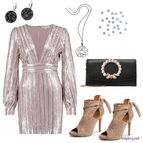 Druga stylizacja została utrzymana w srebrno-złoto-czarnej, równie spójnej tonacji. Jej dominantą jest piękna srebrna minisukienka z długim rękawem. Towarzyszą jej złote botki z odkrytym palcem, a także kopertówka ozdobiona perłowym wianuszkiem, zawieszka o ciekawym kształcie zaprojektowanym na okręgu i okrągłe kolczyki. Kreatorka tego zestawu proponuje dodatkowo, by podbić stawkę, przyklejając miniaturowe cekiny w kształcie gwiazdek na twarz lub… paznokcie. To pomysł bardzo na czasie!