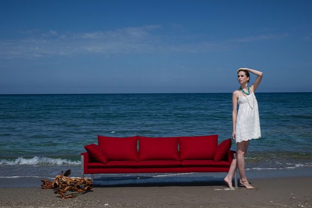 Czerwień pojawia się dopiero w naszych kolejnych propozycjach – iście wakacyjnej, w sam raz na plażę, oraz miejskiej. W pierwszej z nich postawiłyśmy na czerwoną spódnicę, która świetnie kontrastuje z pasiastym kostiumem kąpielowym. Czerwony homar na białej torbie przykuwa wzrok! Zestaw ten uzupełniony o kapelusz z szerokim rondem, wygodne sandały oraz duże, przeciwsłoneczne okulary, stworzy oryginalny plażowy look.