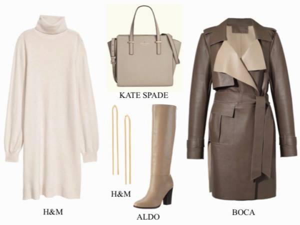 Jasnobeżowa tunika będzie prezentowała się bardzo elegancko z wysokimi do kolan, brązowymi butami. Dodaj do tego płaszcz bawiący się odcieniami beżu i brązu, jasnobrązową torebkę i skromne kolczyki i prosta, lecz elegancka stylizacja gotowa!