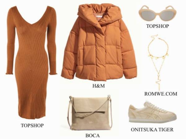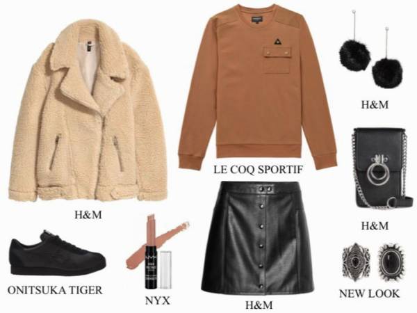 W tym sezonie bardzo modne jest łączenie stylu eleganckiego ze sportowym. Do kremowej spódnicy dobierz bluzę o barwie karmelu oraz sportowe buty z karmelowymi motywami. A do tego… kolczyki pod kolor i jasny płaszcz.